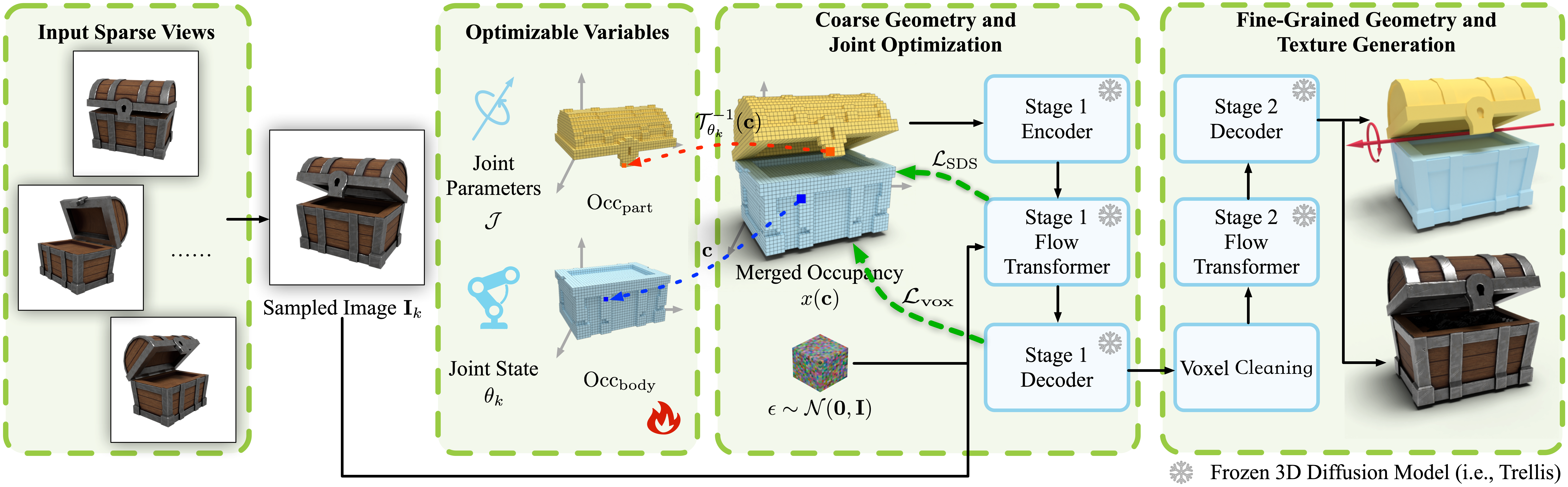 Articulated 3D objects are central to many applications in robotics, AR/VR, and animation. Recent approaches to modeling such objects either rely on optimization-based reconstruction pipelines that require dense-view supervision or on feed-forward generative models that produce coarse geometric approximations and often overlook surface texture. In contrast, open-world 3D generation of static objects has achieved remarkable success, especially with the advent of native 3D diffusion models such as Trellis. However, extending these methods to articulated objects by training native 3D diffusion models poses significant challenges. In this work, we present FreeArt3D, a training-free framework for articulated 3D object generation. Instead of training a new model on limited articulated data, FreeArt3D repurposes a pre-trained static 3D diffusion model (e.g., Trellis) as a powerful shape prior. It extends Score Distillation Sampling (SDS) into the 3D-to-4D domain by treating articulation as an additional generative dimension. Given a few images captured in different articulation states, FreeArt3D jointly optimizes the object’s geometry, texture, and articulation parameters—without requiring task-specific training or access to large-scale articulated datasets. Our method generates high-fidelity geometry and textures, accurately predicts underlying kinematic structures, and generalizes well across diverse object categories. Despite following a per-instance optimization paradigm, FreeArt3D completes in minutes and significantly outperforms prior state-of-the-art approaches in both quality and versatility.